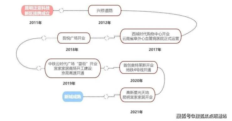 随后,各种配套设施相继实施。2017年,西城时代购物中心开业,云南阜外心血管医院运营;2018年,吴越广场开业;2019年,中铁云时代广场开业,京昆高速开业;2020年,奥特莱斯开业,地铁4号线开业;2021年,高科技星光天地、昆明宜家开业;2022年,文化艺术中心开业。