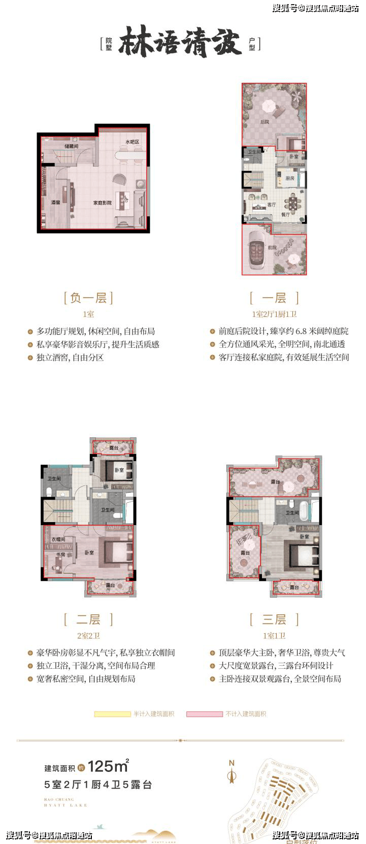 以125㎡以户型类型为例,地下负层为休闲娱乐空间,有步入式收纳室、独立娱乐休闲厅、电影厅、健身房棋牌桌游室等。;一楼为大开间横厅设计,餐厅与客厅相连,不浪费空间;二楼初始公寓主卧设计,空位可改造成两个房间,可作为客房或书房;三楼主卧舒适私密。为了设计带露台的阳光主卧套房,露台可以改造成阳光书房,享受自由的湖居生活。