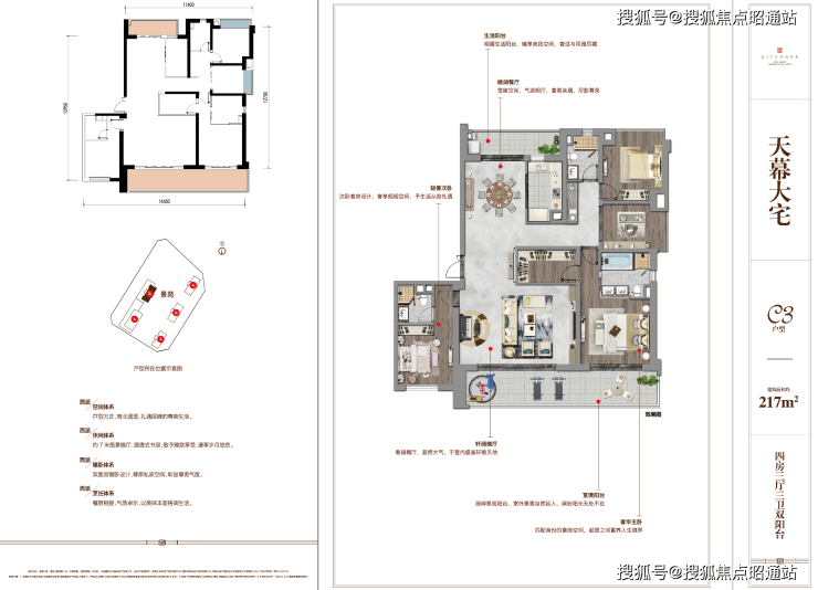 约3.6米层高,270度超大景观阳台,SPA泳池;中西式配套双厨房,120平奢阔客厅,尽显无界生活