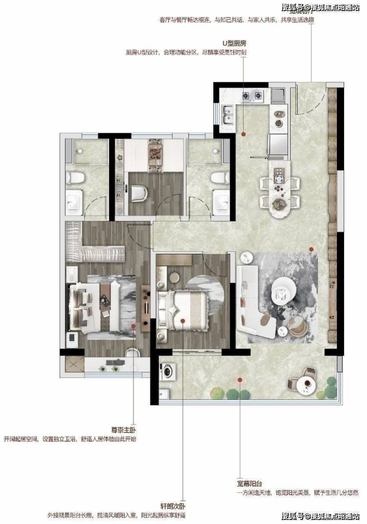 户型亮点:格局方正+约6.5米瞰景阳台+U型厨房紧邻餐厅+主卧套间设计