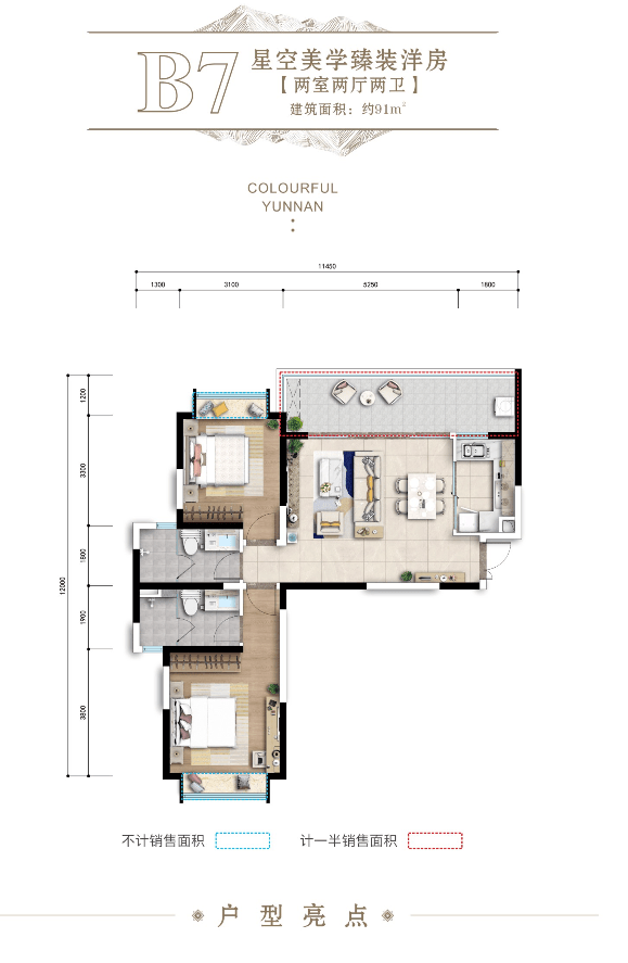 纯洋房社区,公摊面积小,得房率高;依山就势的围合分布式布局,保证了家家有景,户户独享的景观资源。