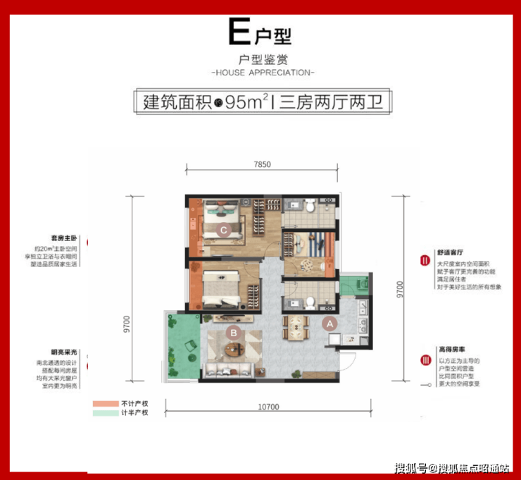 三居:82-95㎡(高层,2梯4-6户,得房率89%-93%)