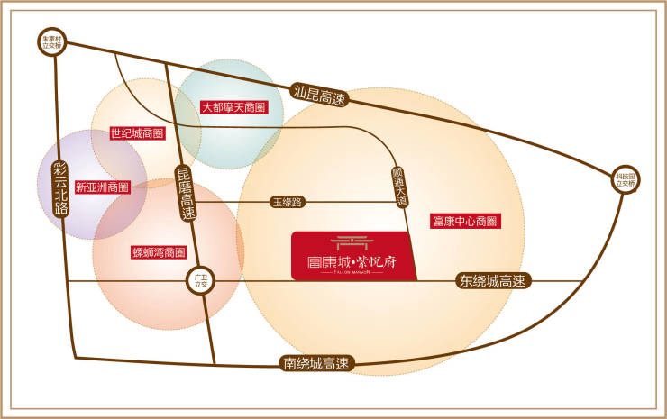 项目毗邻30万㎡富康城昆明经开中心(包含写字楼、购物中心及国内首家万豪双品牌五星级酒店——喜来登&德尔塔酒店),是云南自贸区昆明片区首个大型城市综合体;同时,项目毗邻螺蛳湾商圈、新亚洲商圈、世纪城商圈、大都摩天商圈,五大醇熟商圈环伺,繁华生活无需等待。