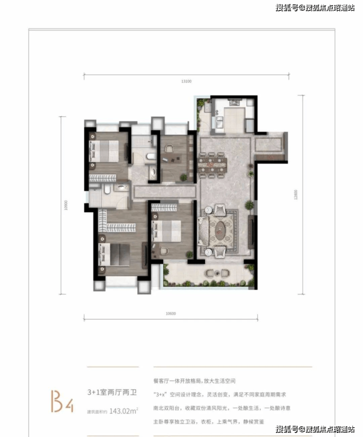 同样朝南的公寓类似99平米的公寓,格局空间更大,卫生间更多。主卧空间比较大,有衣帽间和独立卫生间。