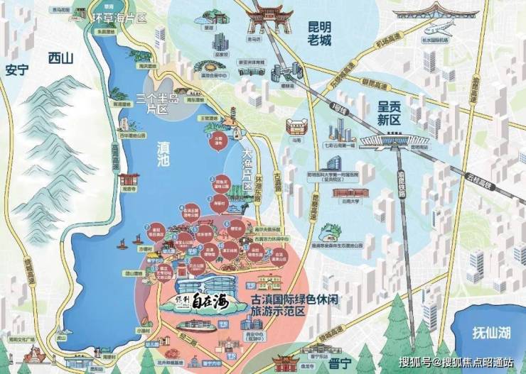 七大生态景观公园:国立艺专旧址公园、文创公园、古滇精品湿地公园、团山湿地公园、捞鱼河公园、渔浦寒泉森林生态湿地公园、郑和公园