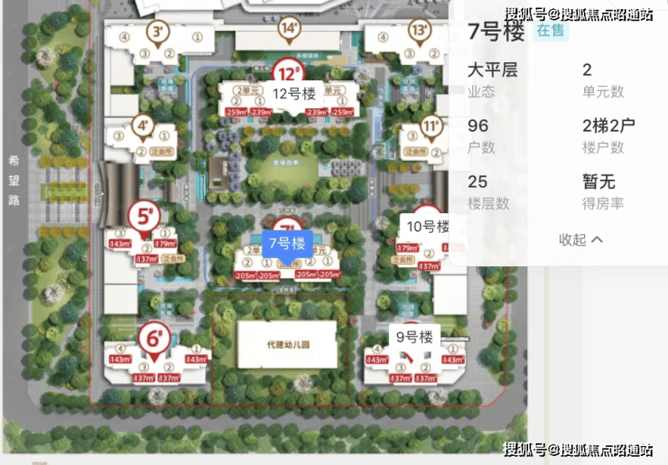 7和12栋为板式楼,其中7栋总高25层,正南北朝向,梯户比为2梯2户,户型分布205㎡户型,12栋户型面积为240和260的大平层。