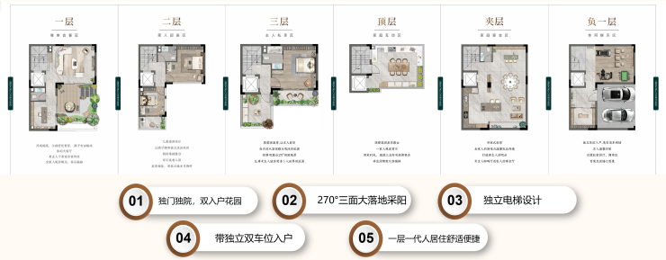 ⑤宅为崇:打造以组团空间为基础的邻里回归,3合院、4合院、8合院,多居住形态,居住尺度符合现代人居理念,高附加值可变空间,地下两层、庭院、露台超高赠送。