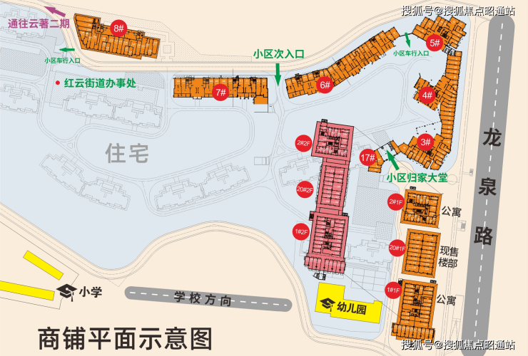 【位置】:以龙泉路沿线,项目外围沿线排布,分为公寓底商、售楼部商业、社区内部商业、社区外围沿线底商多种类型,共计207户;