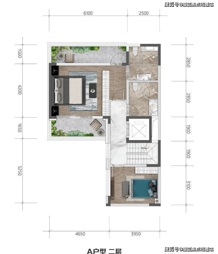 二层:两卧室布局,次卧套房设计,带大面积景观阳台,私密性较好;