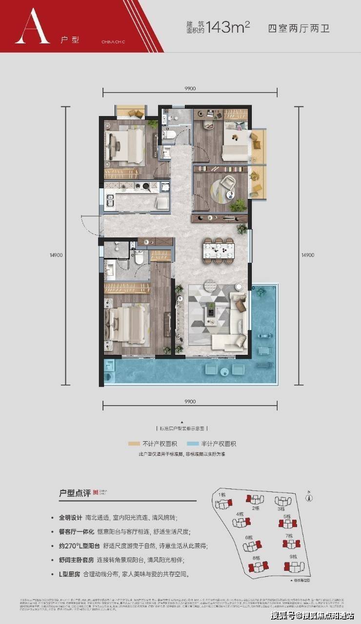 D3地块9栋:2梯4户,纯板式住宅,精装交付,装修标准,1600/㎡;南北通透,四面采光通风,超大超宽楼间距,约10米“L”型270°转角阳台,每个户型都有超大景观阳台。