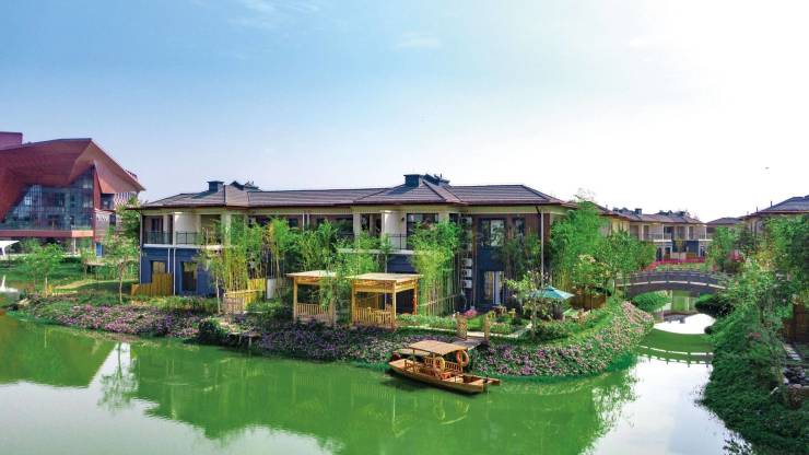 一期田园水乡占地约3000亩,以原特色村寨、小镇中心商业街、花语温泉、温泉酒店民宿群、旅居地产等为主。先期已取得800亩用地并完成6亿元建设投资。利用毗邻盈江的原生资源引水入园,以形成小区内较大的湖面和纵横交错的多条水系,以全新的湿地景观打造户户滨水而居的田园水系里的艺术生活。