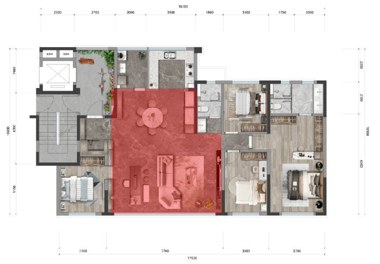 ②7.7米开间客厅区域增加一房,直接四房秒变五房。
