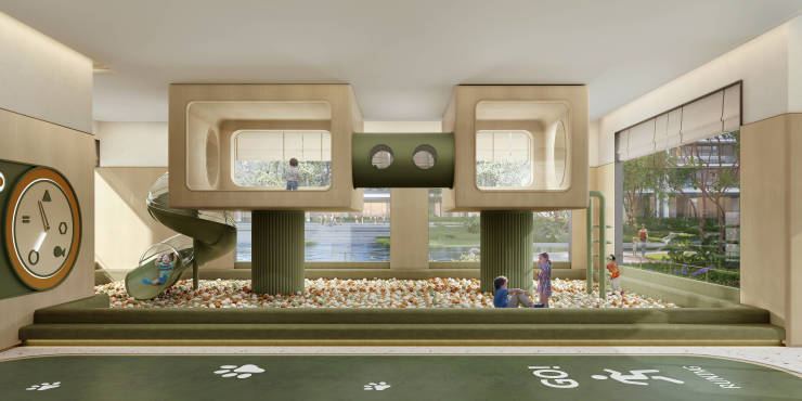 约50米奢阔门庭,约9.2米挑高尺度精筑归家仪式感;库班绿、普拉达绿石材搭配香槟色不锈钢线条,勾勒出“漂浮云顶”般梦幻景象;