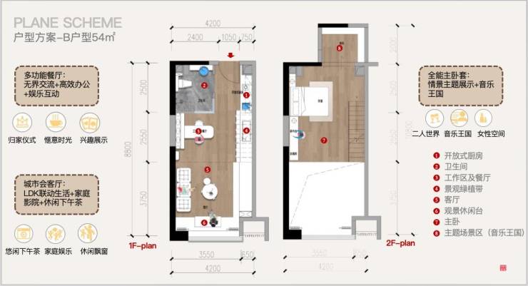 B户型:建筑面积约54㎡(4.2米开间、民水民电、朝南)