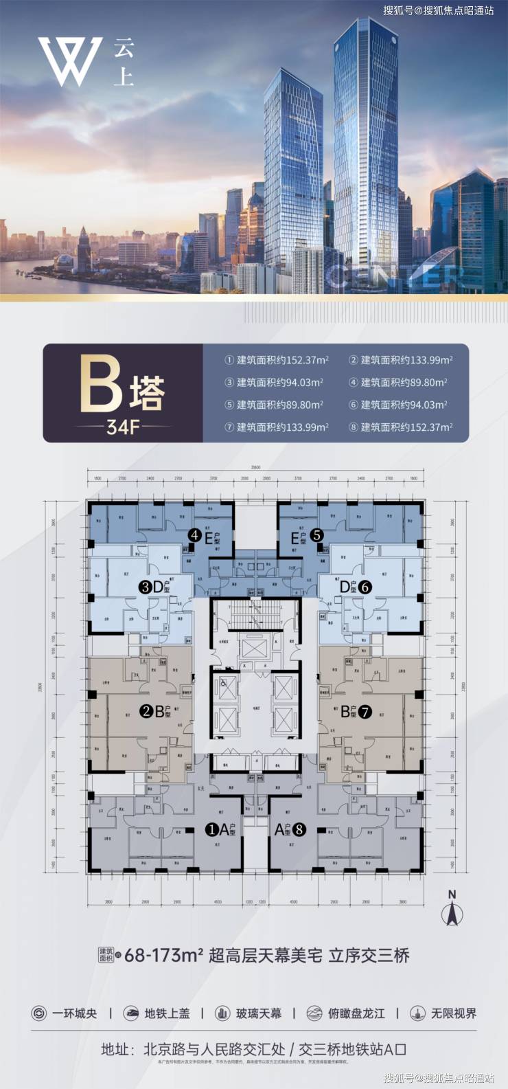 交三桥丨一环城央丨城市贵脉丨天际视野云上项目总占地约29.5亩,总建筑面积22万方,集国际化商业、约260米商务地标写字楼、约160米超高层住宅的城市综合体。商业裙楼:双塔中间打造商业裙楼,为业主和商务菁英人…