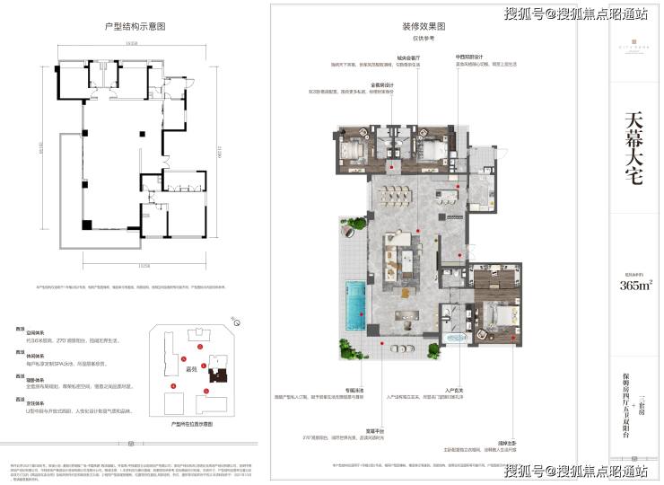 约3.6米层高,270度超大景观阳台,SPA泳池;中西式配套双厨房,120平奢阔客厅,尽显无界生活