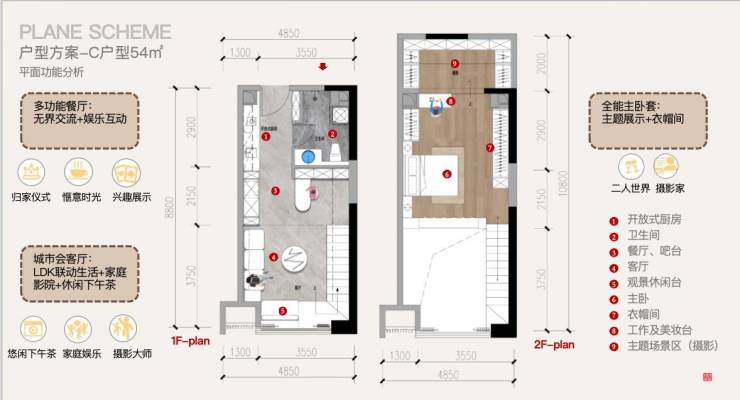 C户型:建筑面积约54㎡(4.2米开间、民水民电、朝南)