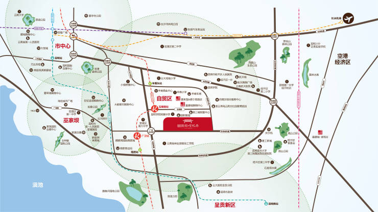 项目毗邻30万㎡富康城昆明经开中心(包含写字楼、购物中心及国内首家万豪双品牌五星级酒店——喜来登&德尔塔酒店),是云南自贸区昆明片区首个大型城市综合体;同时,项目毗邻螺蛳湾商圈、新亚洲商圈、世纪城商圈、大都摩天商圈,五大醇熟商圈环伺,繁华生活无需等待。