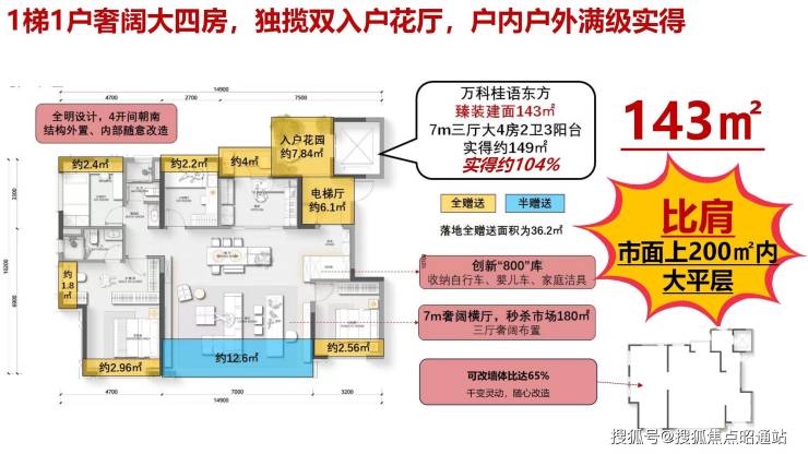 户型:109-190㎡精装住宅,主力户型为109㎡(三房)、128-143㎡(四房)、175-190㎡(顶跃),得房率94%-146%(顶跃最高);