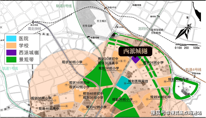 项目东南侧配建24班小学,周边6宗教育用地规划(含幼儿园至高中)