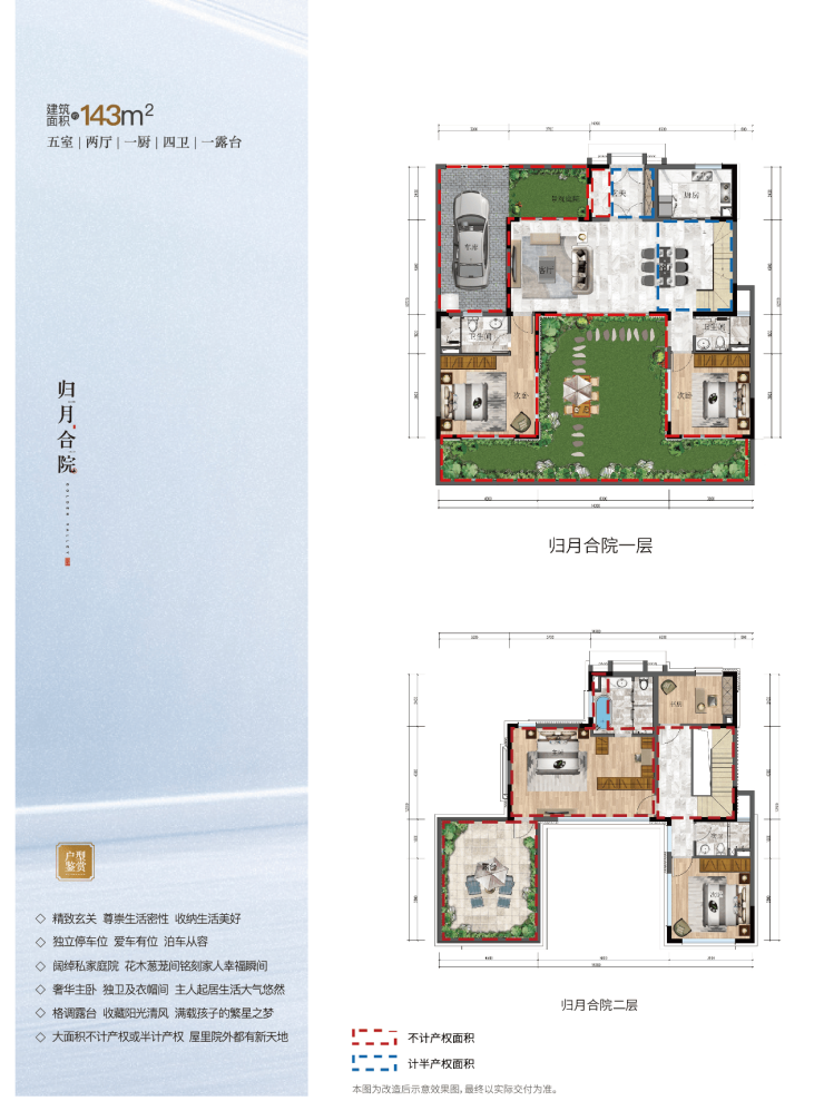 合院143产品:嵩山溪谷143㎡的产品,是五房两厅一厨四卫一花园的设计,还有160㎡的不记产权面积(一楼的花园、独立车库、二楼的主卧、过道、露台都是全赠送;一楼的厨房跟餐厅半面积赠送),实得面积约300㎡,还有院子里的独立车库。