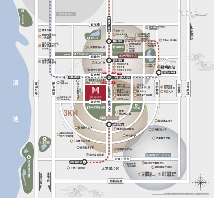 项目位于呈贡城市主干道彩云南路与聚贤街交汇处,项目距离地铁1、4号线换乘中心联大街、谊康南路站仅500米;距离联大立交仅900米,快速畅达全城。