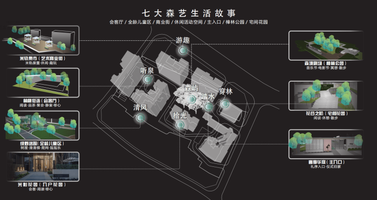 结合现状场地,保留28棵古樟树,运用现代设计手法表现“森系艺术社区”的自然气质,结合“森系”与“艺术”的景观设计理念,延续生态基底,融入艺术美学,打造品质奢享、森系共融的社区。