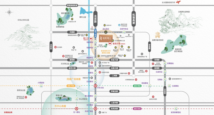 周边5公里范围内包含五大繁华商业中心:和谐广场、嘉年华购物中心、中汇商业广场、欣都龙城购物中心、同德昆明广场,多元业态全覆盖,举步即享缤纷万象的都会生活,潮流购物、品质消费、轻奢体验一站式满足。